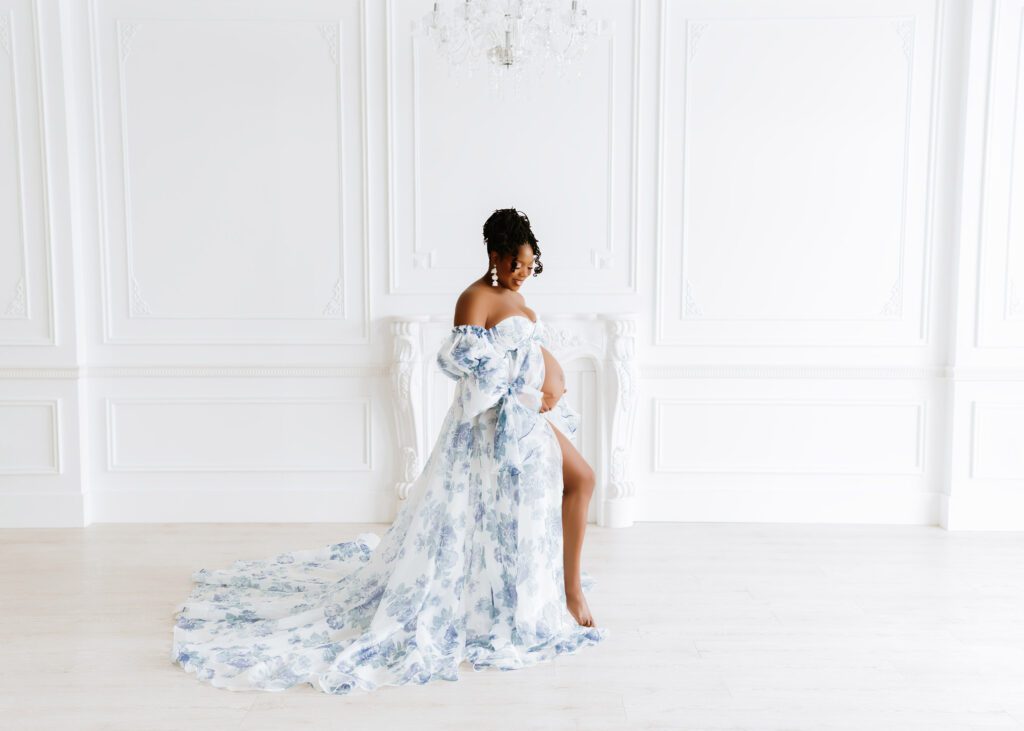 At my Winnipeg maternity studio, I offer a curated wardrobe for expecting mothers, including elegant gowns and casual dresses perfect for both fine art maternity portraits and lifestyle maternity photos.